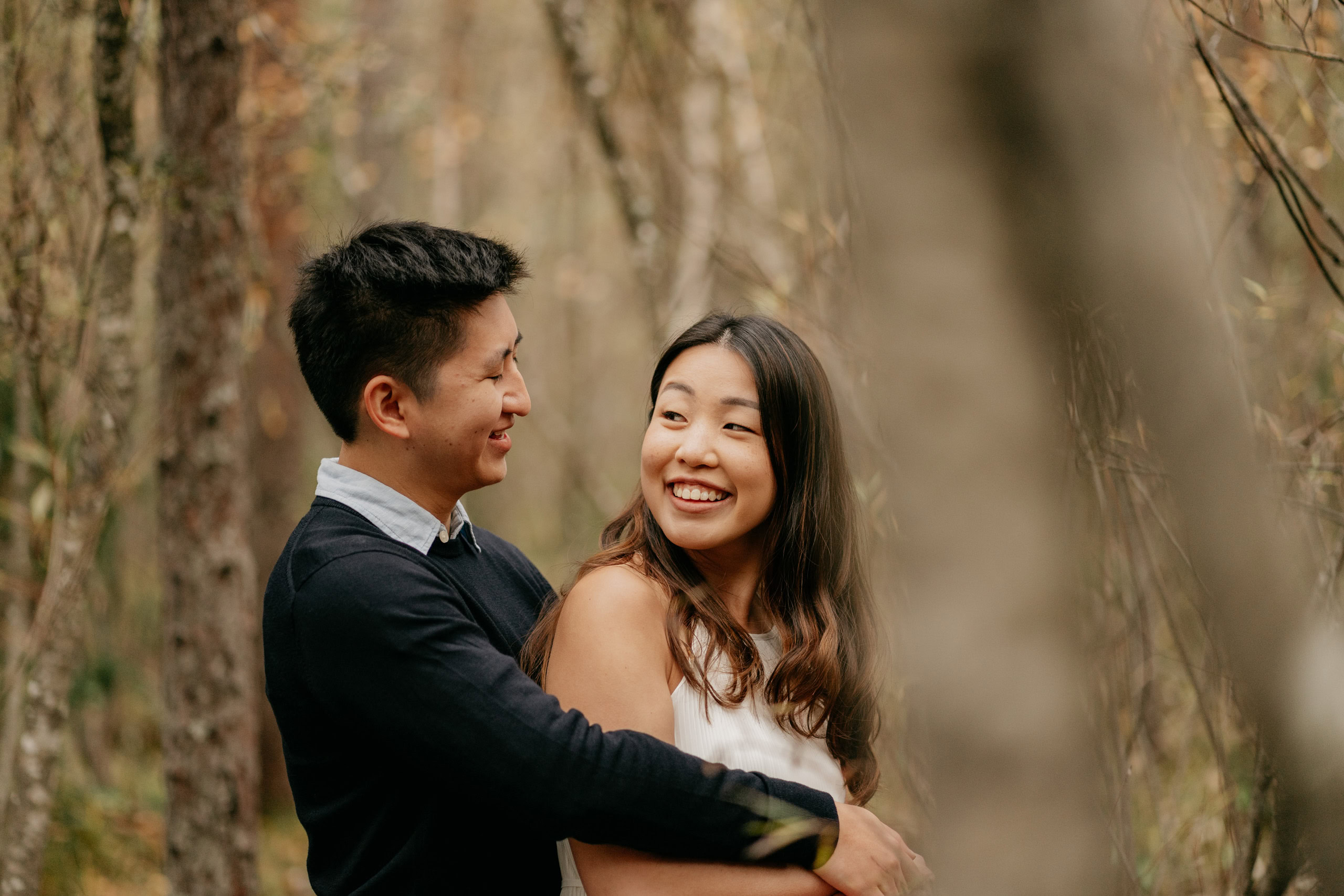 Couple smiling in a forest setting